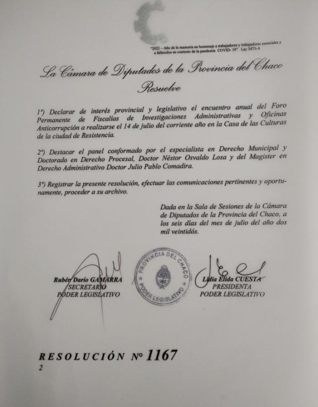 La Cámara de Diputados de la Provincia del Chaco a través de la Resolución N° 1167 rubricada por la Presidenta Lidia Elida Cuesta, resolvió declarar de interés provincial y legislativo el encuentro anual del Foro Permanente de Fiscalías de Investigaciones Administrativas y Oficinas Anticorrupción que se realiza este 14 de julio en la Casa de las Culturas de la ciudad de Resistencia.